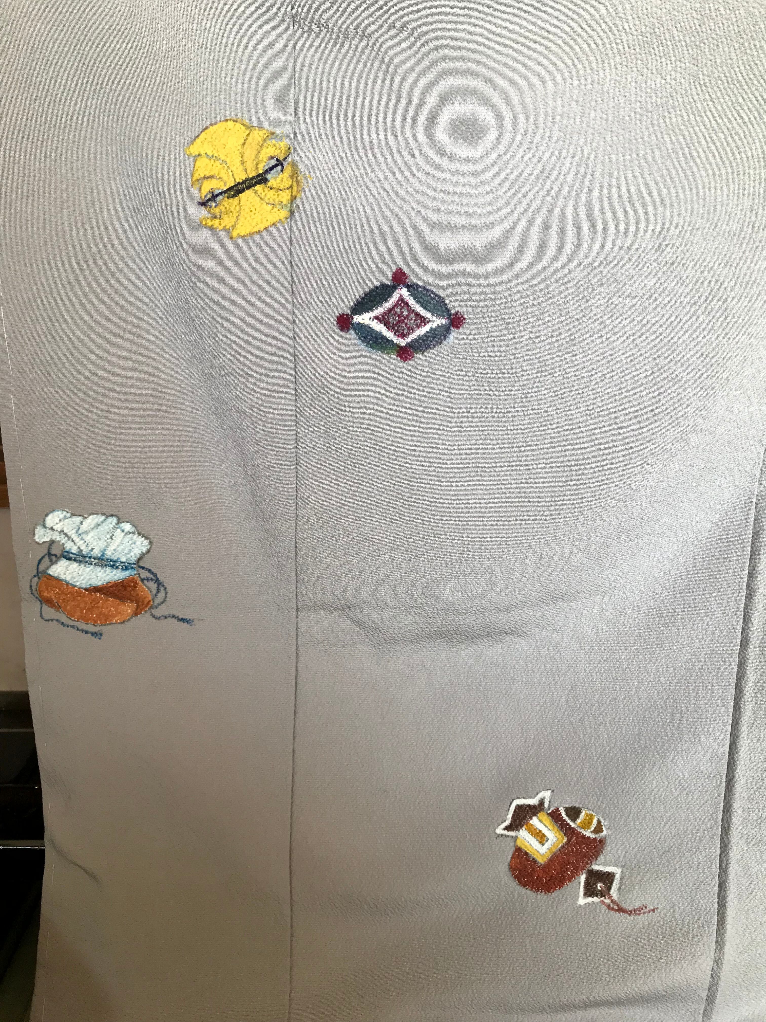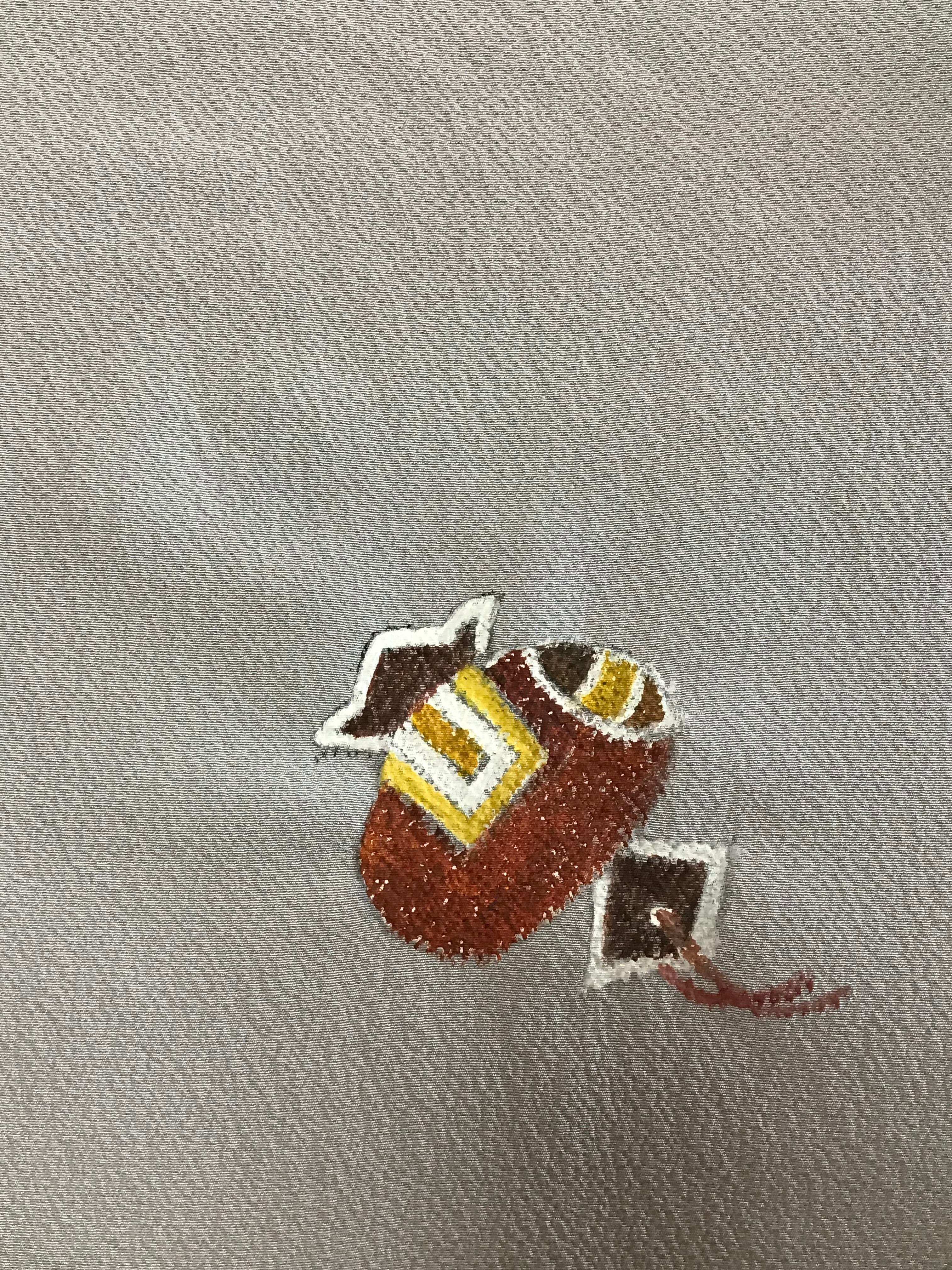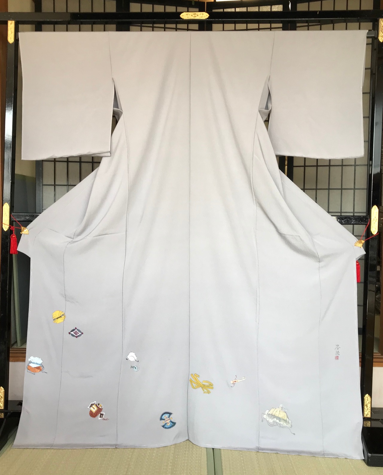 灰藤色のやわらかな地色に、宝尽くしのような縁起柄が品よく並び、可愛らしさと格調の両方を備えた意匠です。